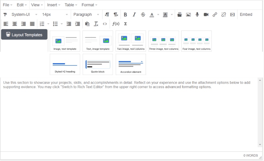 See below: the rich text editor with layout template options, including the new styled h2 heading, quote block, and accordion element.