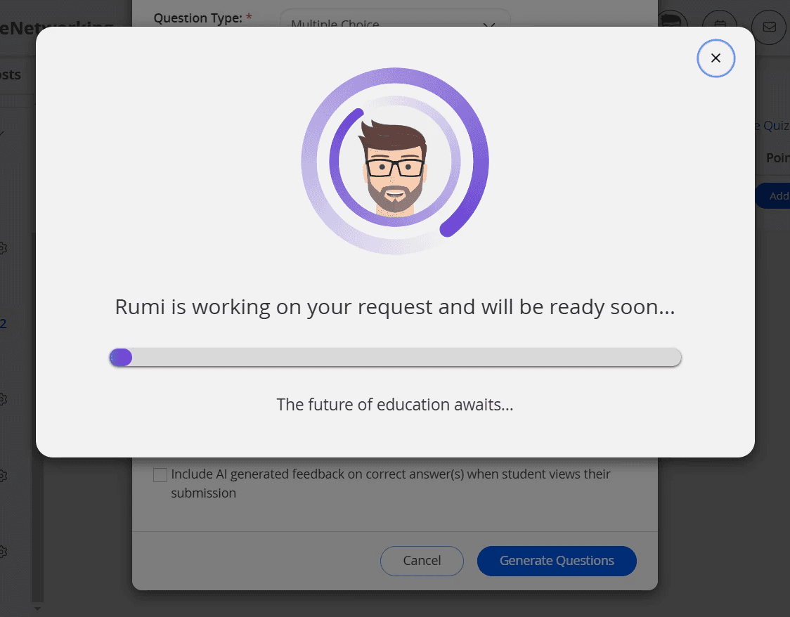 See below: loading animation while Rumi AI generates content. The progress bar moves smoothly and various education-related quotes cycle below.